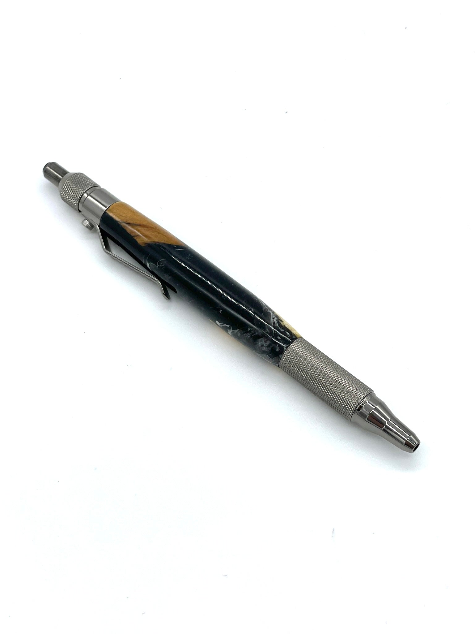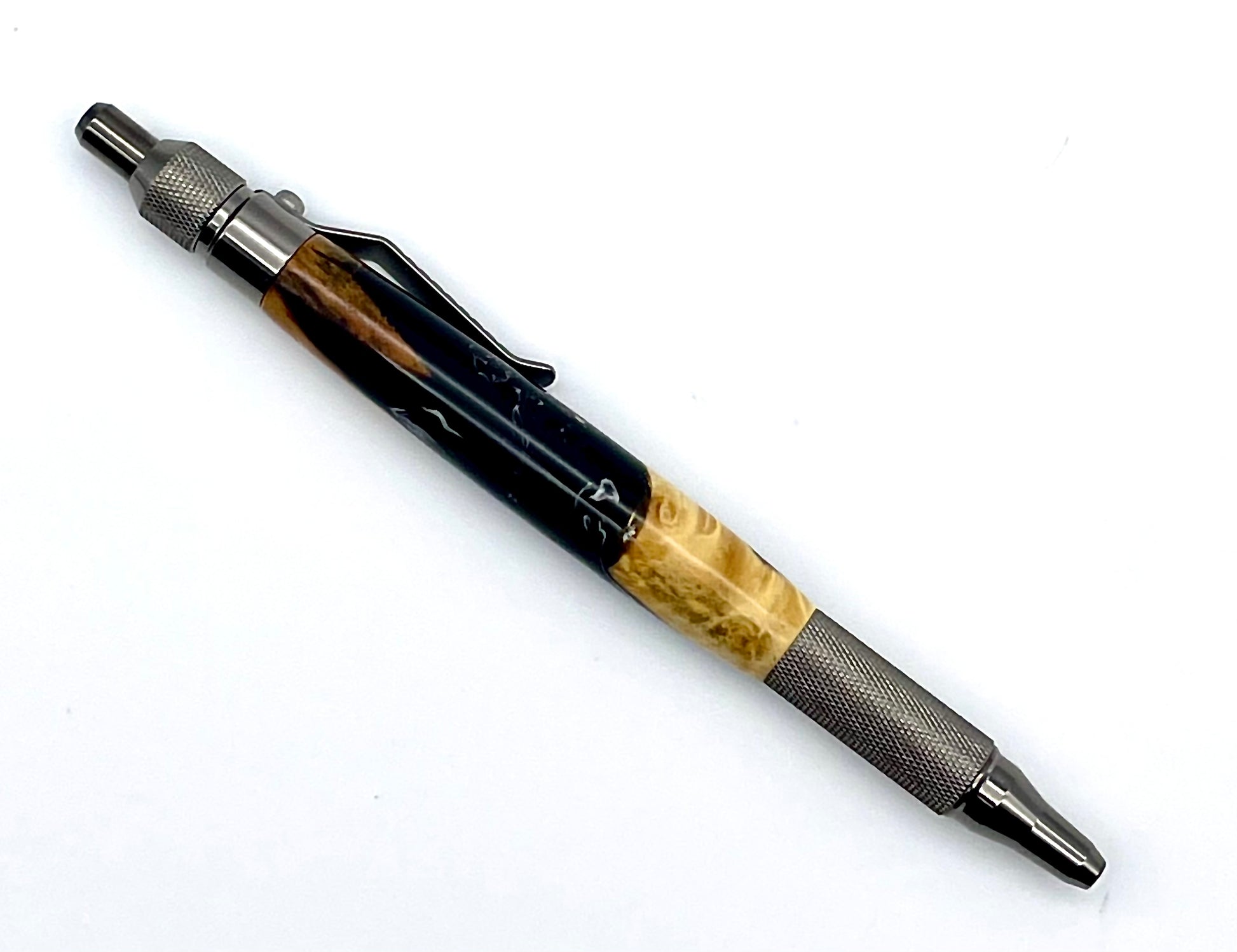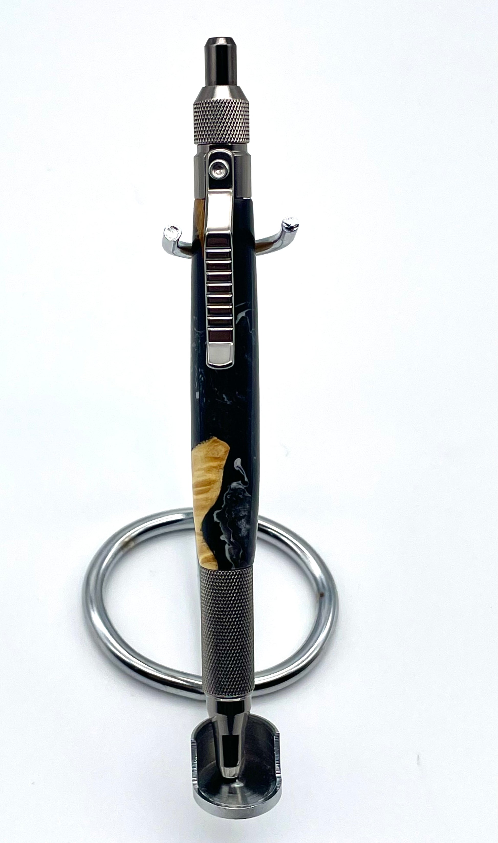 Black and White Ballpoint EDC Click Pen; Epoxy resin and maple burl; Hand casted and hand turned